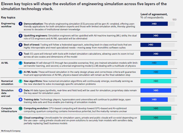 McKinsey also dug deep into Engineering AI, interviewing 24 senior simulation leaders. Early adopters are already reporting up to 50% reductions in time to market, 15-60% improvements in product performance, and 30-50% gains in workforce productivity. One of the more interesting tensions in the report is around tooling, where 60% of interviewees expect a shift toward best-of-breed modular tools over monolithic software suites, though a vocal minority argues that workflow simplicity will keep companies anchored to comprehensive single-vendor platforms. [McKinsey]