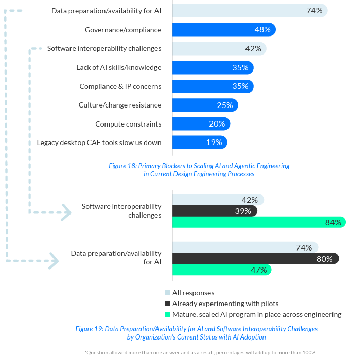 The survey identifies three primary blockers: data preparation/availability for AI (74%), governance and compliance concerns (48%), and software interoperability challenges (42%).