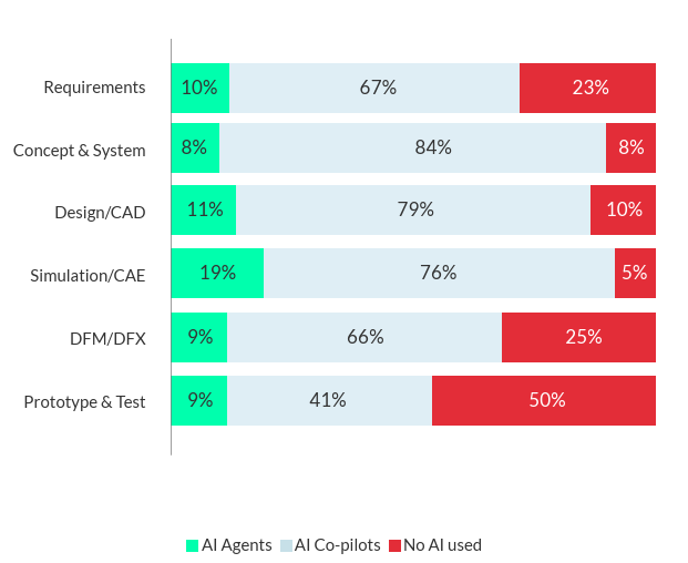 Agentic AI adoption is concentrated in a few key areas: simulation and CAE (19%), followed by design and CAD (11%), and requirements engineering (10%).